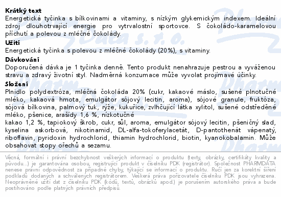 Složení CZ: plnidlo: polydextrosa, poleva z mléčné čokolády 20 % (cukr, kakaové máslo, sušené plnotučné mléko, kakaová hmota, emulgátor: sójové lecitiny, aromata), sójový granulát, fruktóza, sójová bílkovina, palmový olej, rýžová mouka, kukuřičná mouka, zvlhčující látka: xylitol, sušené odstředěné mléko, pšeničná mouka, arašídy 1,6 %, kakaový prášek se sníženým obsahem tuku 1,2 %, tapiokový škrob, cukr, jedlá sůl, aromata, emulgátor: sójové lecitiny, pšeničný slad, kyselina L-askorbová, nikotinamid, DL-alfa-tokoferylacetát, D-pantothenan vápenatý, riboflavin, pyridoxin hydrochlorid, thiamin hydrochlorid, biotin, kyanokobalamin. Může obsahovat stopy skořápkových plodů a sezamu. Doporučené dávkování: 1 tyčinka denně. Produkt nenahrazuje pestrou a vyváženou stravu. Skladujte v suchu, chraňte před teplem. Minimální trvanlivost do: viz etiketa. Vyrobeno v EU.