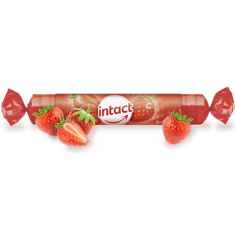 Intact pastilky z hroznového cukru s příchutí jahoda s vitaminem C. Doplněk stravy, vitamínový přípravek.