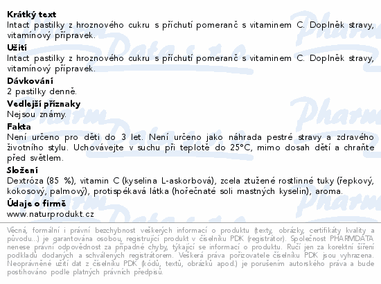 Intact pastilky z hroznového cukru s příchutí pomeranč s vitaminem C. Doplněk stravy, vitamínový přípravek.