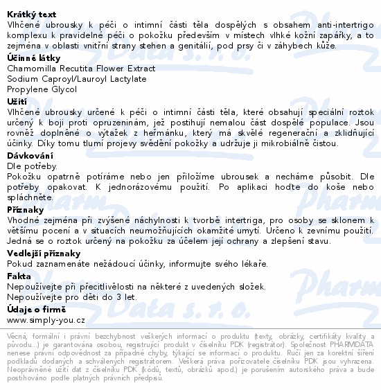 Vlhčené ubrousky k péči o intimní části těla dospělých s obsahem anti-intertrigo komplexu k pravidelné péči o pokožku především v místech vlhké kožní zapářky, a to zejména v oblasti vnitřní strany stehen a genitálií, pod prsy či v záhybech kůže.