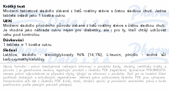 Moderní tabletové sladidlo získané z listů rostliny stévie s čistou sladkou chutí. Jedna tableta osladí jako 1 kostka cukru.