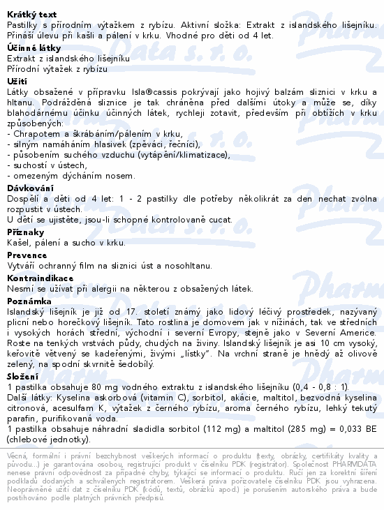 Pastilky s přírodním výtažkem z rybízu. Aktivní složka: Extrakt z islandského lišejníku. Přináší úlevu při kašli a pálení v krku. Vhodné pro děti od 4 let.