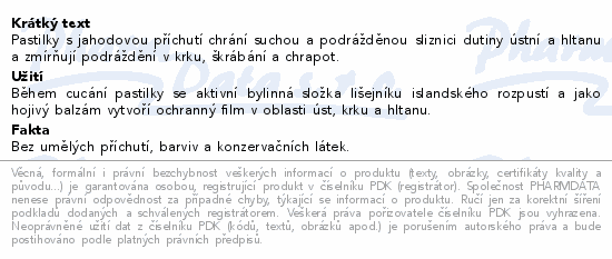 Pastilky s jahodovou příchutí chrání suchou a podrážděnou sliznici dutiny ústní a hltanu a zmírňují podráždění v krku, škrábání a chrapot.