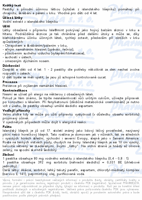 Pastilky s přírodní účinnou látkou (výtažek z islandského lišejníku) pomáhají při chrapotu, škrábání a pálení v krku. Vhodné pro děti od 4 let.
