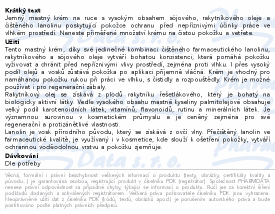 Jemný mastný krém na ruce s vysokým obsahem sójového, rakytníkového oleje a čištěného lanolinu poskytující pokožce ochranu před nepříznivými účinky práce ve vlhkém prostředí. Naneste přiměřené množství krému na čistou pokožku a vetřete.