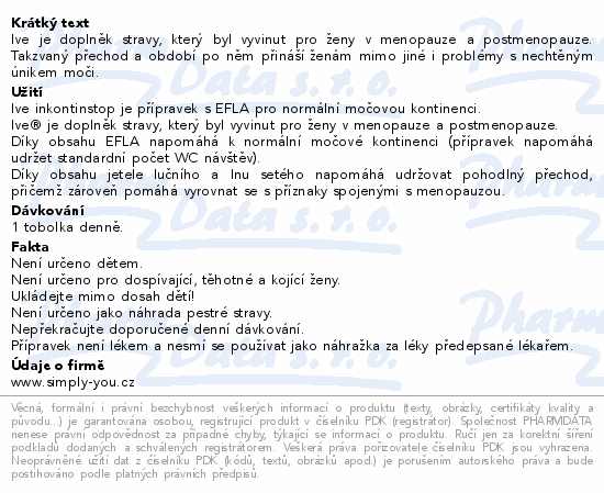 IVE InkontinStop je unikátní přírodní doplněk stravy ve formě tobolek, který obsahuje extrakt ze semene tykve obecné. Produkt byl vyvinut pro ženy v období menopauzy a postmenopauzy. Toto období s sebou nese mimo jiné i problémy s nechtěným únikem moči. Přípravek je šetrný a bezpečný pro ženský organismus.