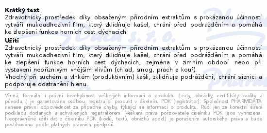 Zdravotnický prostředek díky obsaženým přírodním extraktům s prokázanou účinností vytváří mukoadhezivní film, který zklidňuje kašel, chrání před podrážděním a pomáhá ke zlepšení funkce horních cest dýchacích.