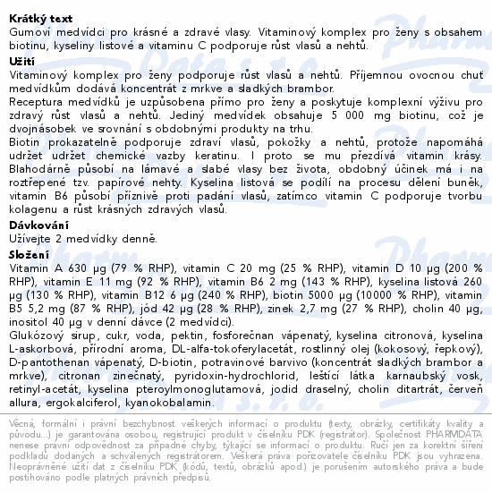 Gumoví medvídci pro krásné a zdravé vlasy. Vitaminový komplex pro ženy s obsahem biotinu, kyseliny listové a vitaminu C podporuje růst vlasů a nehtů.