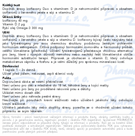Doplněk stravy Izoflavony Duo s vitamínem D je nehormonální přípravek s obsahem izoflavonů z červeného jetele a sóji a vitamínu D.