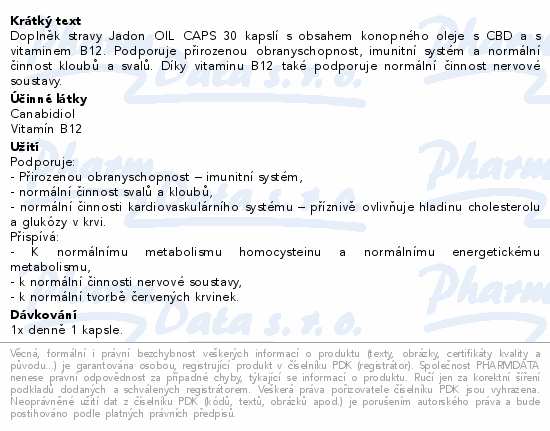Doplněk stravy Jadon OIL CAPS 30 kapslí s obsahem konopného oleje s CBD a s vitaminem B12. Podporuje přirozenou obranyschopnost, imunitní systém a normální činnost kloubů a svalů. Díky vitaminu B12 také podporuje normální činnost nervové soustavy.