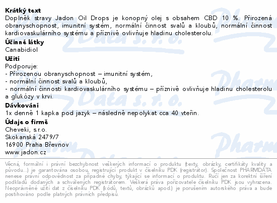 Doplněk stravy Jadon Oil Drops je konopný olej s obsahem CBD 10 %. Přirozená obranyschopnost, imunitní systém, normální činnost svalů a kloubů, normální činnost kardiovaskulárního systému a příznivě ovlivňuje hladinu cholesterolu.