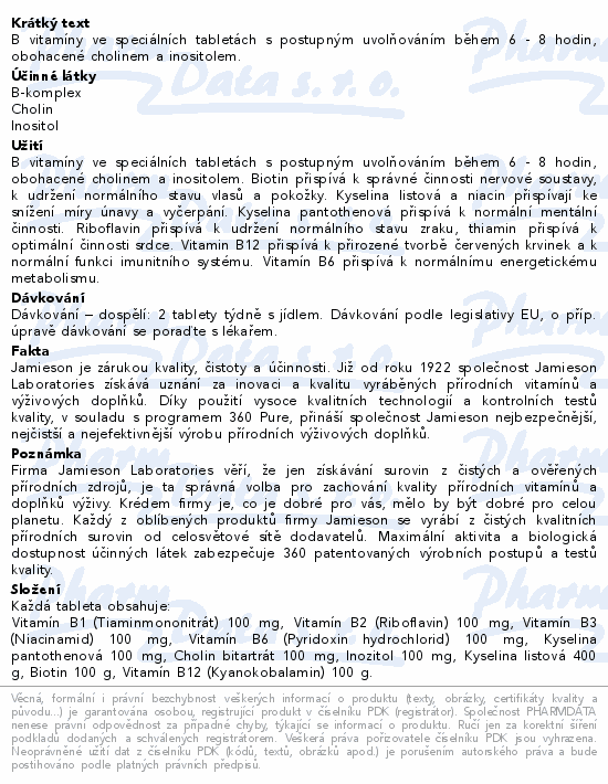 B vitamíny ve speciálních tabletách s postupným uvolňováním během 6 - 8 hodin, obohacené cholinem a inositolem.