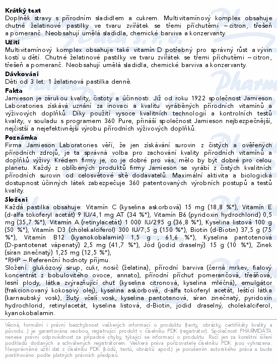 Doplněk stravy s přírodním sladidlem a cukrem. Multivitamínový komplex obsahuje chutné želatinové pastilky ve tvaru zvířátek se třemi příchutěmi – citron, třešeň a pomeranč. Neobsahují umělá sladidla, chemické barviva a konzervanty.