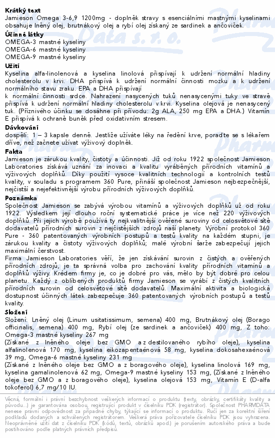 Jamieson Omega 3-6,9 1200mg - doplněk stravy s esenciálními mastnými kyselinami obsahuje lněný olej, brutnákový olej a rybí olej získaný ze sardinek a ančoviček.