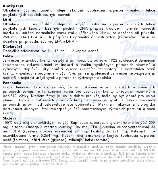 Obsahuje 500 mg čistého oleje z korýšů Euphausia superba v malých lehce polykatelných kapslích bez rybí pachuti.