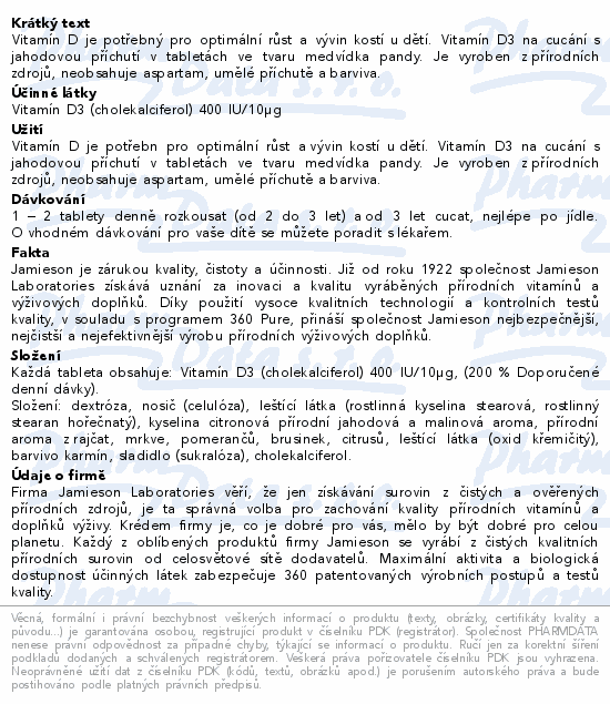 Doplněk stravy Jamieson s vitamínem D3 400 I.U. pro Vaše děti vhodný na podporu imunity, kosti, svaly a zuby a pro normální vstřebávání a využití vápníku. Komfortní užívání cucavých tablet ve tvaru medvídka pandy s lahodnou jahodovou příchutí.