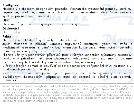 Novinka v praktickém designovém pouzdře. Mechanické vysunování pomády. která rty regeneruje, zklidňuje, zjemňuje a chrání před povětrnostními vlivy. Nová varianta výrobku pro náročného zákazníka.