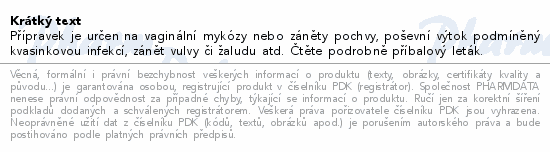 Přípravek je určen na vaginální mykózy nebo záněty pochvy, poševní výtok podmíněný kvasinkovou infekcí, zánět vulvy či žaludu atd. Čtěte pozorně příbalový leták.