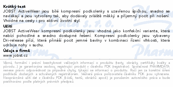 JOBST ActiveWear jsou bílé kompresní podkolenky s uzavřenou špičkou, snadno se navlékají a jsou vytvořeny tak, aby dodávaly zvláště měkký a příjemný pocit při nošení. Vhodné na cesty i pro aktivní životní styl.