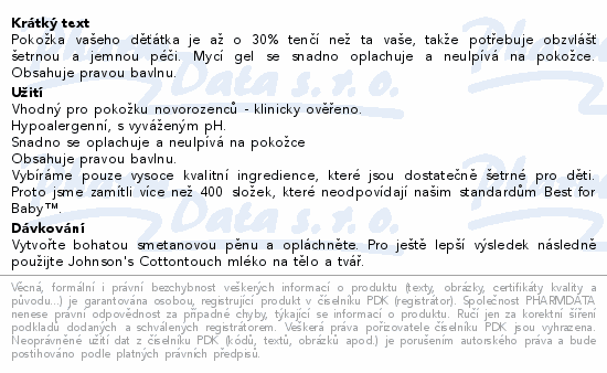 Johnson´s Baby Cottontouch koupel a mycí gel 2v1 obsahuje složení se skutečnou bavlnou,speciálně navrženou a dokonale vyváženou pro citlivou pokožku novorozence. Díky receptuře NO MORE TEARS nedráždí oči. Jemně čistí a chrání s ultra lehkou pěnou. Snadno se oplachuje a neulpívá na pokožce. Neobsahuje barviva, parabeny, ftaláty, sírany, alkohol a mýdlo. Pediatricky a dermatologicky testováno.