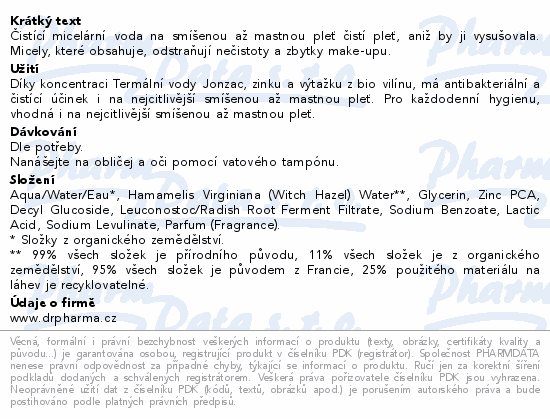 JONZAC PURE Micelární voda smíšená pleť BIO 500ml