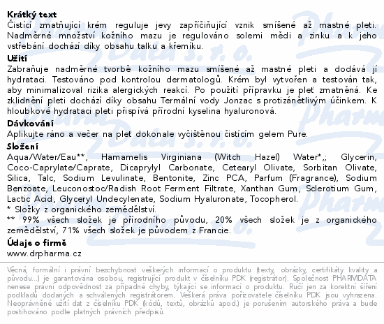 Čistící zmatňující krém reguluje jevy zapříčiňující vznik smíšené až mastné pleti. Nadměrné množství kožního mazu je regulováno solemi mědi a zinku a k jeho vstřebání dochází díky obsahu talku a křemíku.