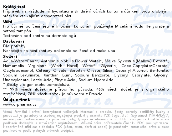 Přípravek na každodenní hydrataci a zklidnění očních kontur s účinkem proti drobným vráskám vznikajícím dehydratací pleti.