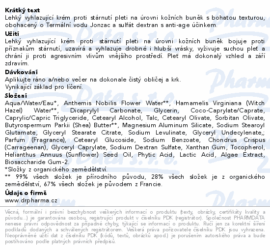 Lehký vyhlazující krém proti stárnutí pleti na úrovni kožních buněk s bohatou texturou, obohacený o Termální vodu Jonzac a sulfát dextran s anti-age účinkem.