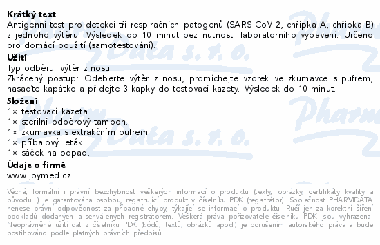 Antigenní test pro detekci tří respiračních patogenů (SARS-CoV-2, chřipka A, chřipka B) z jednoho výtěru. Výsledek do 10 minut bez nutnosti laboratorního vybavení. Určeno pro domácí použití (samotestování).