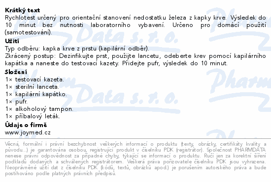 Rychlotest určený pro orientační stanovení nedostatku železa z kapky krve. Výsledek do 10 minut bez nutnosti laboratorního vybavení. Určeno pro domácí použití (samotestování).
