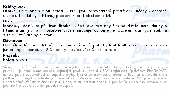 Lízátka Junior-angin proti bolesti v krku jsou zdravotnický prostředek určený k ochraně sliznic ústní dutiny a hltanu, především při bolestech v krku.