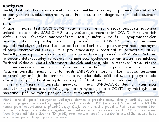 Rychlý test pro kvalitativní detekci antigen nukleokapsidových proteinů SARS-CoV-2 přítomných ve vzorku nosního výtěru. Pro použití při diagnostickém sebetestování in-vitro.