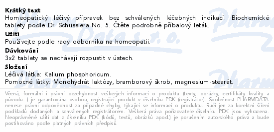 Homeopatický léčivý přípravek bez schválených léčebných indikací. Biochemické tablety podle Dr. Schüsslera No. 5. Čtěte pozorně příbalový leták.