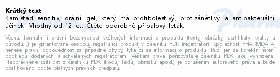 Kamistad senzitiv, orální gel se používá při méně závažných infekcích dásní a sliznice dutiny ústní u dospělých a dospívajících od 12 let (projevujících se např. zarudnutím, zduřením, tvorbou vřídků nebo puchýřků, krvácivostí a bolestivostí dásní, nebo jako bolestivá, drobná kruhovitá ložiska na sliznici tváří, na dásních či na jazyku).