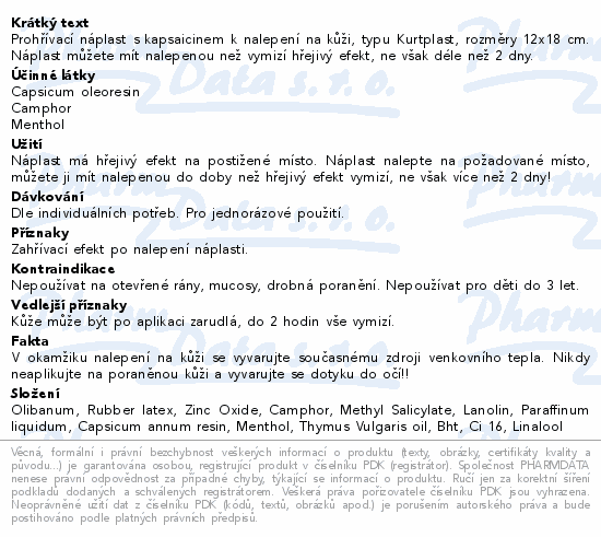 Prohřívací náplast s kapsaicinem k nalepení na kůži, typu Kurtplast, rozměry 12x18 cm. Náplast můžete mít nalepenou než vymizí hřejivý efekt, ne však déle než 2 dny.
