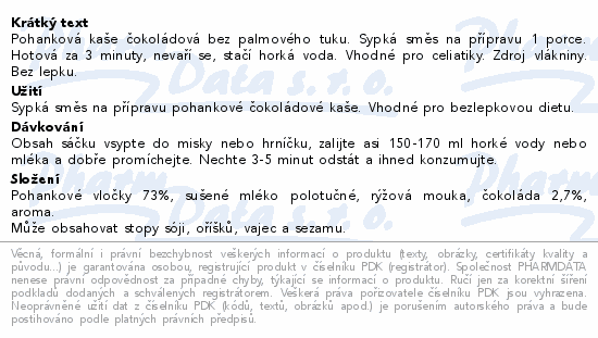 Pohanková kaše čokoládová bez palmového tuku. Sypká směs na přípravu 1 porce. Hotová za 3 minuty, nevaří se, stačí horká voda. Vhodné pro celiatiky. Zdroj vlákniny. Bez lepku.