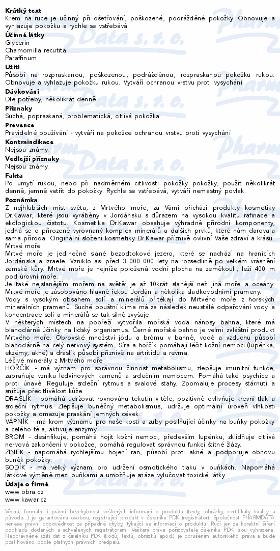 Krém na ruce je učinný při ošetřování, poškozené, podrážděné pokožky. Obnovuje a vyhlazuje pokožku a rychle se vstřebává.