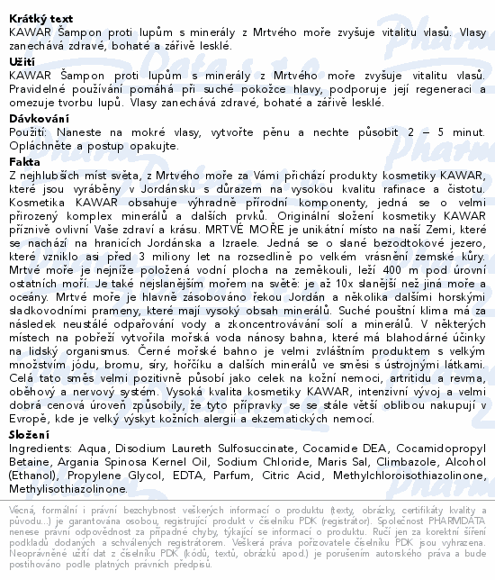 KAWAR Šampon proti lupům s minerály z Mrtvého moře zvyšuje vitalitu vlasů. Vlasy zanechává zdravé, bohaté a zářivě lesklé.