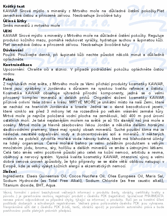KAWAR Sírové mýdlo s minerály z Mrtvého moře na důkladné čistění pokožky.Pleť zanechává čistou a přirozeně zářivou. Neobsahuje živočišné tuky.