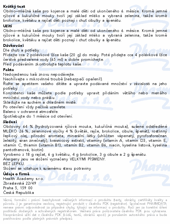 Obilno–mléčná kaše pro kojence a malé děti od ukončeného 6. měsíce. Kromě jemné rýžové a kukuřičné mouky tvoří její základ mléko a vybraná zelenina, takže kromě brokolice, květáku a rajčat děti poznají i chuť cibulky a špenátu.