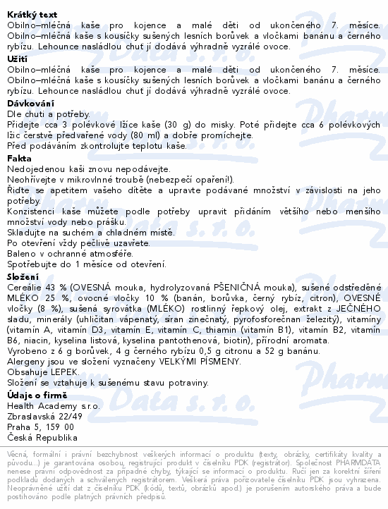 Obilno–mléčná kaše pro kojence a malé děti od ukončeného 7. měsíce. Obilno–mléčná kaše s kousíčky sušených lesních borůvek a vločkami banánu a černého rybízu. Lehounce nasládlou chuť jí dodává výhradně vyzrálé ovoce.