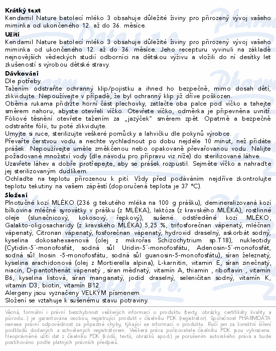Kendamil Nature batolecí mléko 3 obsahuje důležité živiny pro přirozený vývoj vašeho miminka od ukončeného 12. až do 36. měsíce.