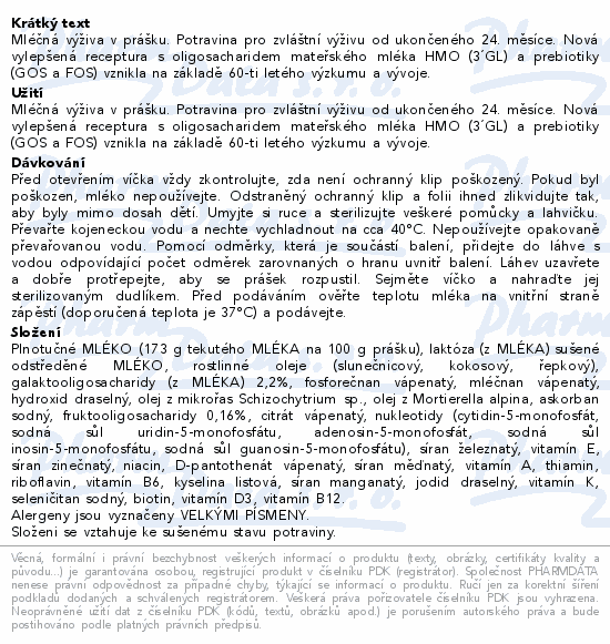 Mléčná výživa v prášku. Potravina pro zvláštní výživu od ukončeného 24. měsíce. Nová vylepšená receptura s oligosacharidem mateřského mléka HMO (3´GL) a prebiotiky (GOS a FOS) vznikla na základě 60-ti letého výzkumu a vývoje.