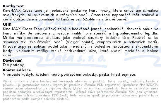 Kine-MAX Cross tape je neelastická páska ve tvaru mřížky, která umožňuje stimulaci spoušťových, akupunkturních a reflexních bodů. Cross tape napomáhá řešit svalové a cévní obtíže. Balení obsahuje 40 kusů ve vel. 52x44mm v tělové barvě.