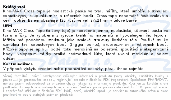 Kine-MAX Cross tape je neelastická páska ve tvaru mřížky, která umožňuje stimulaci spoušťových, akupunkturních a reflexních bodů. Cross tape napomáhá řešit svalové a cévní obtíže. Balení obsahuje 120 kusů ve vel. 27x21mm v tělové barvě.