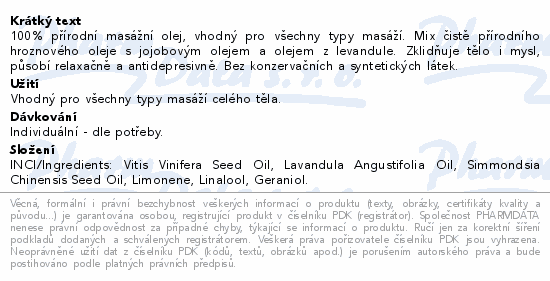 100% přírodní masážní olej, vhodný pro všechny typy masáží. Mix čistě přírodního hroznového oleje s jojobovým olejem a olejem z levandule. Zklidňuje tělo i mysl, působí relaxačně a antidepresivně. Bez konzervačních a syntetických látek.