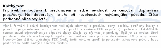 Přípravek se používá k předcházení a léčbě nevolnosti při cestování dopravními prostředky. Na doporučení lékaře při nevolnostech nejrůznějšího původu. Čtěte pozorně příbalový leták.