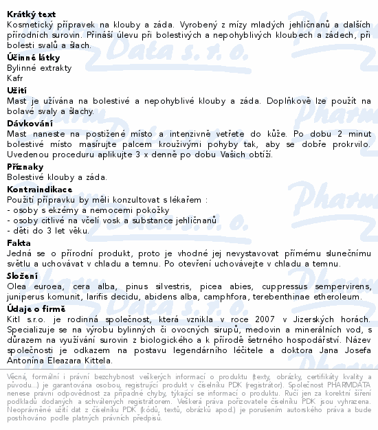 Kosmetický přípravek na klouby a záda. Vyrobený z mízy mladých jehličnanů a dalších přírodních surovin. Přináší úlevu při bolestivých a nepohyblivých kloubech a zádech, při bolesti svalů a šlach.