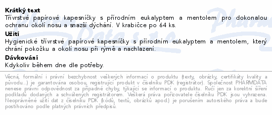 Třívrstvé papírové kapesníčky s přírodním eukalyptem a mentolem pro dokonalou ochranu okolí nosu a snazší dýchání. V krabičce po 64 ks.