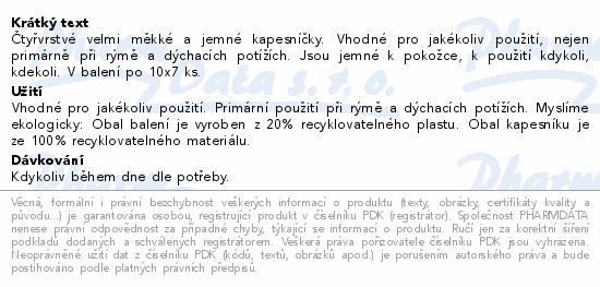 Čtyřvrstvé velmi měkké a jemné kapesníčky. Vhodné pro jakékoliv použití, nejen primárně při rýmě a dýchacích potížích. Jsou jemné k pokožce, k použití kdykoli, kdekoli. V balení po 10x7 ks.